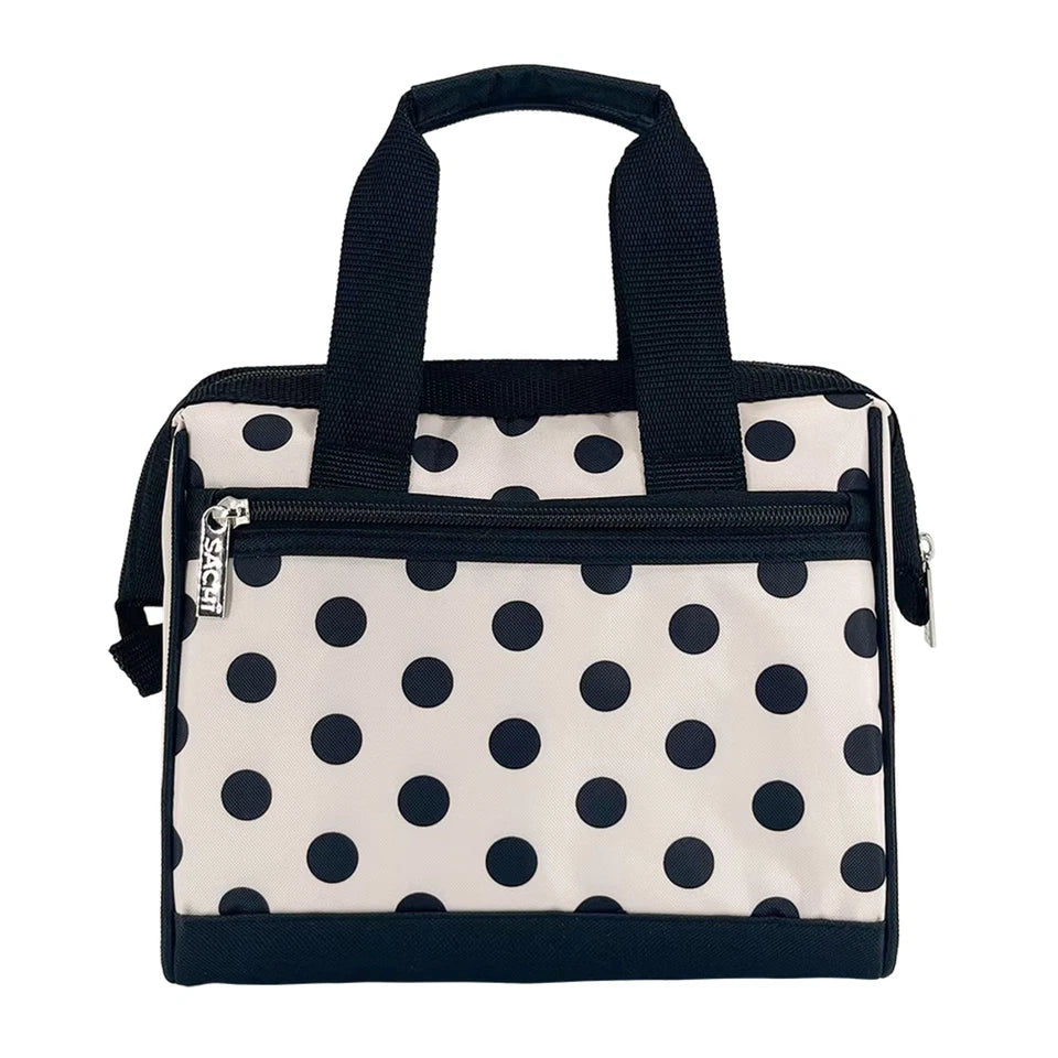 The Sachi Insulated Lunch Bag in Polka Dots combines style and functionality for office, school, or outings. Its leak-proof design and large zip-top opening provide easy access, while a rear pocket stores snacks or utensils. Use ice packs to keep food cool longer, placing them on top and minimizing bag openings to maintain temperature. Pack items of similar temperature tightly to maximize freshness.