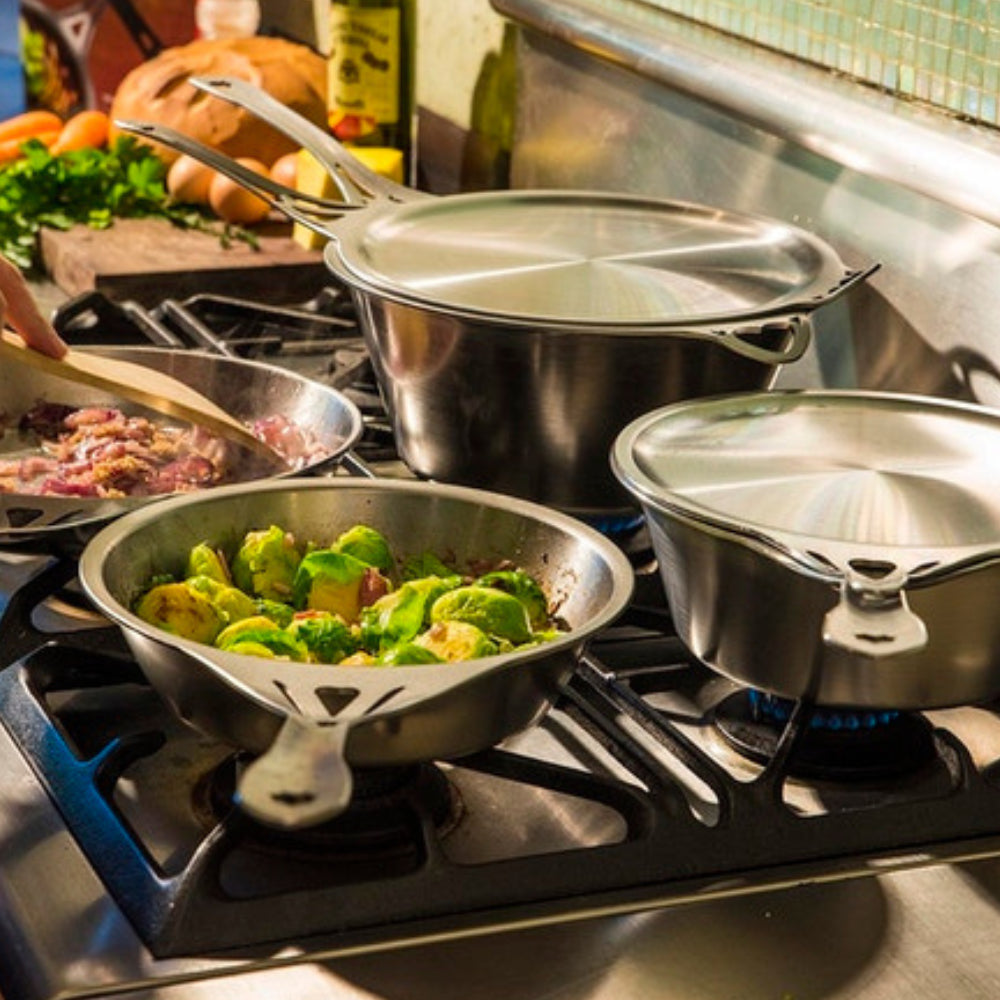 Unlike coated cookware, nöni™ pans contain no synthetic chemicals, non-nickel, and no nonsense. Just clean, conductive stainless steel that cooks like iron, cleans like stainless, and is tough enough to last generations.
