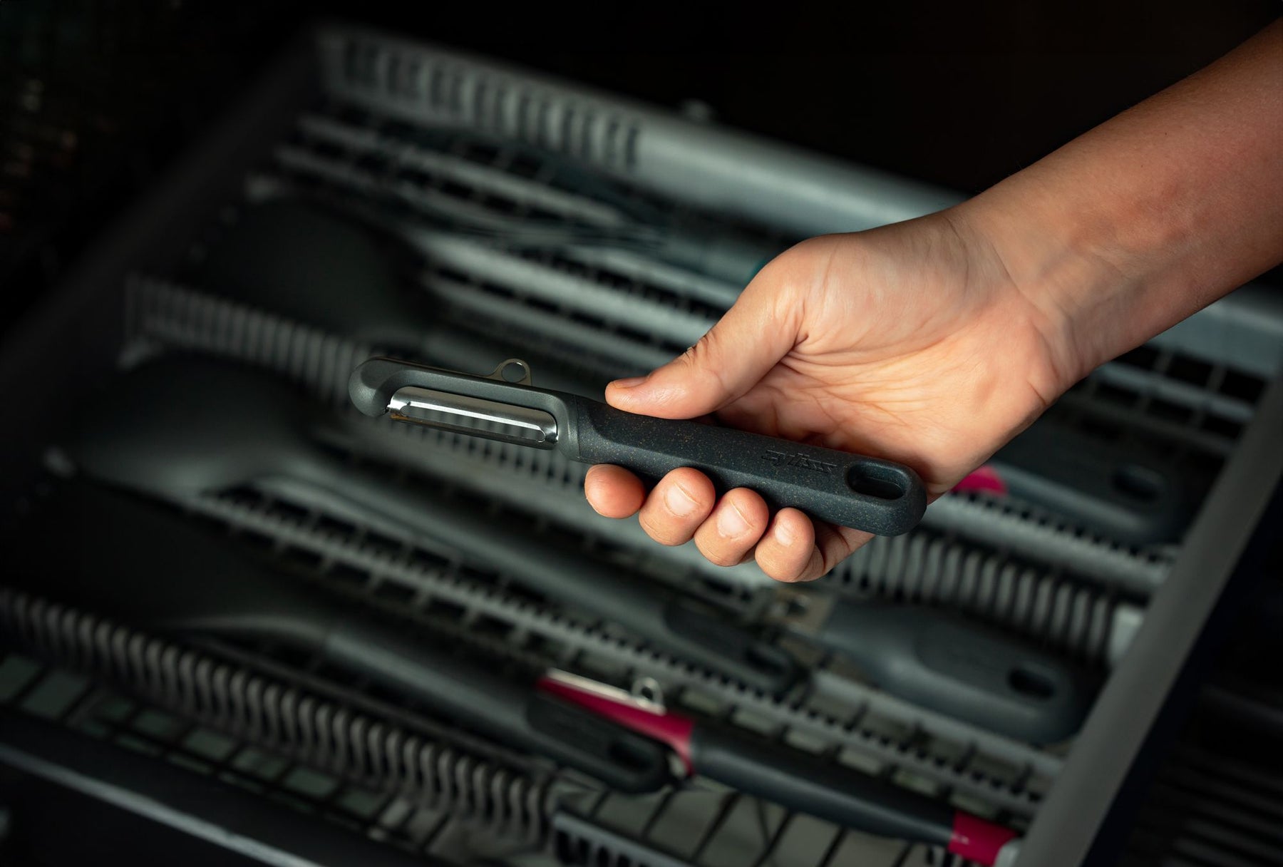 The Zyliss Swivel Peeler comes with a finely sharpened stainless steel blade that effortlessly handles the toughest skins on fruits and vegetables. Its ergonomic handle comfortably fits all hand sizes, enhancing control and ease of use. This peeler includes a protective blade cover for safe storage and an integrated eye cutter for precision blemish removal. Crafted with an eco-friendly handle containing up to 50% wheat straw, it combines sustainability with functionality. Additionally, it is dishwasher safe for convenient cleaning.